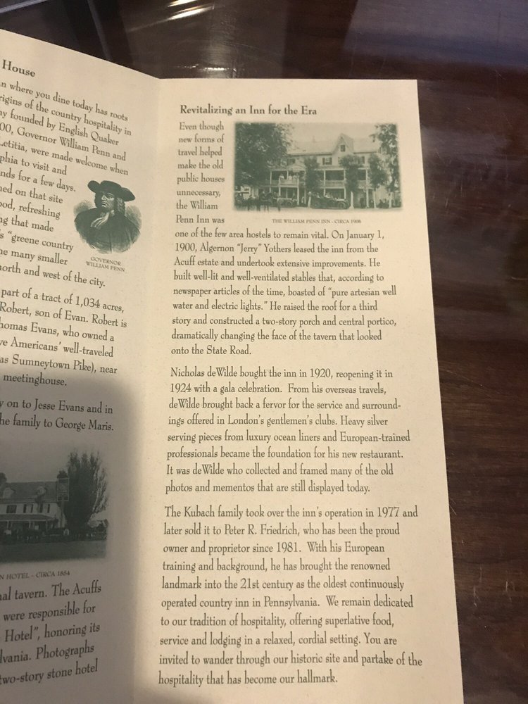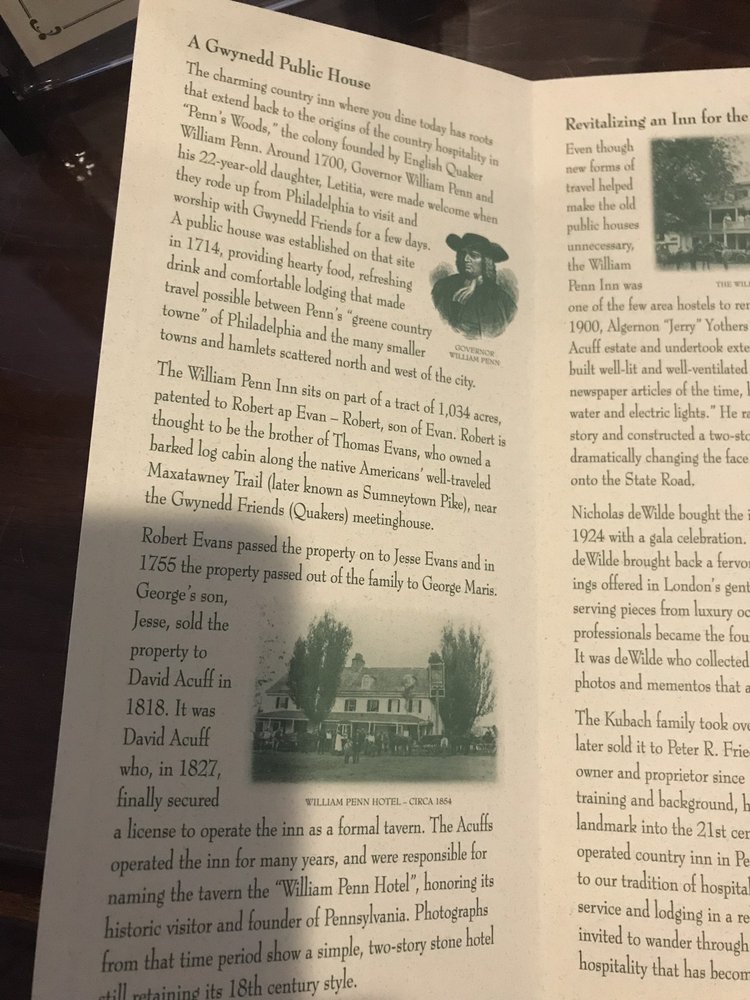 "Introducing the menu at William Penn Inn, a historic venue offering a classy dining experience in Gwynedd, PA. With a diverse menu featuring New American and traditional American dishes, this restaurant has something for everyone. From vegan options to hearty seafood and steaks, they have it all. The ambiance is classic and traditional, adding to the overall dining experience. Customers rave about the quality of the food, with dishes like the heavenly escargot, creamy mashed potatoes, and perfect prime rib standing out as favorites. The Sunday brunch buffet is a must-try, with a variety of elevated dishes like raw oysters and delicious salads. The attentive service and attention to detail make dining at William Penn Inn a truly memorable experience."
